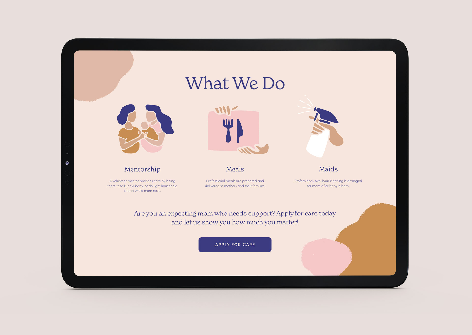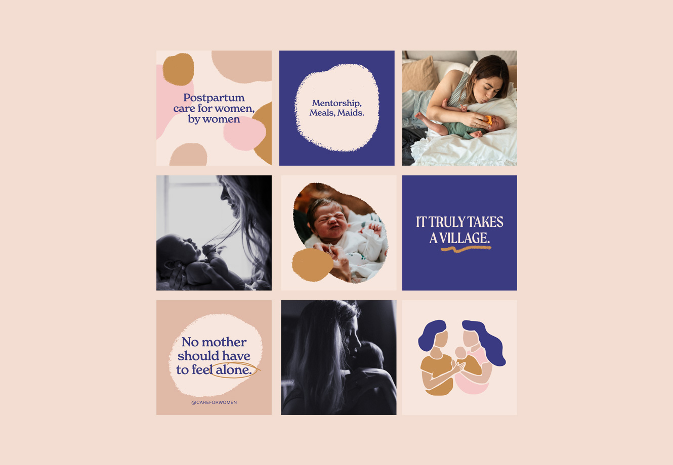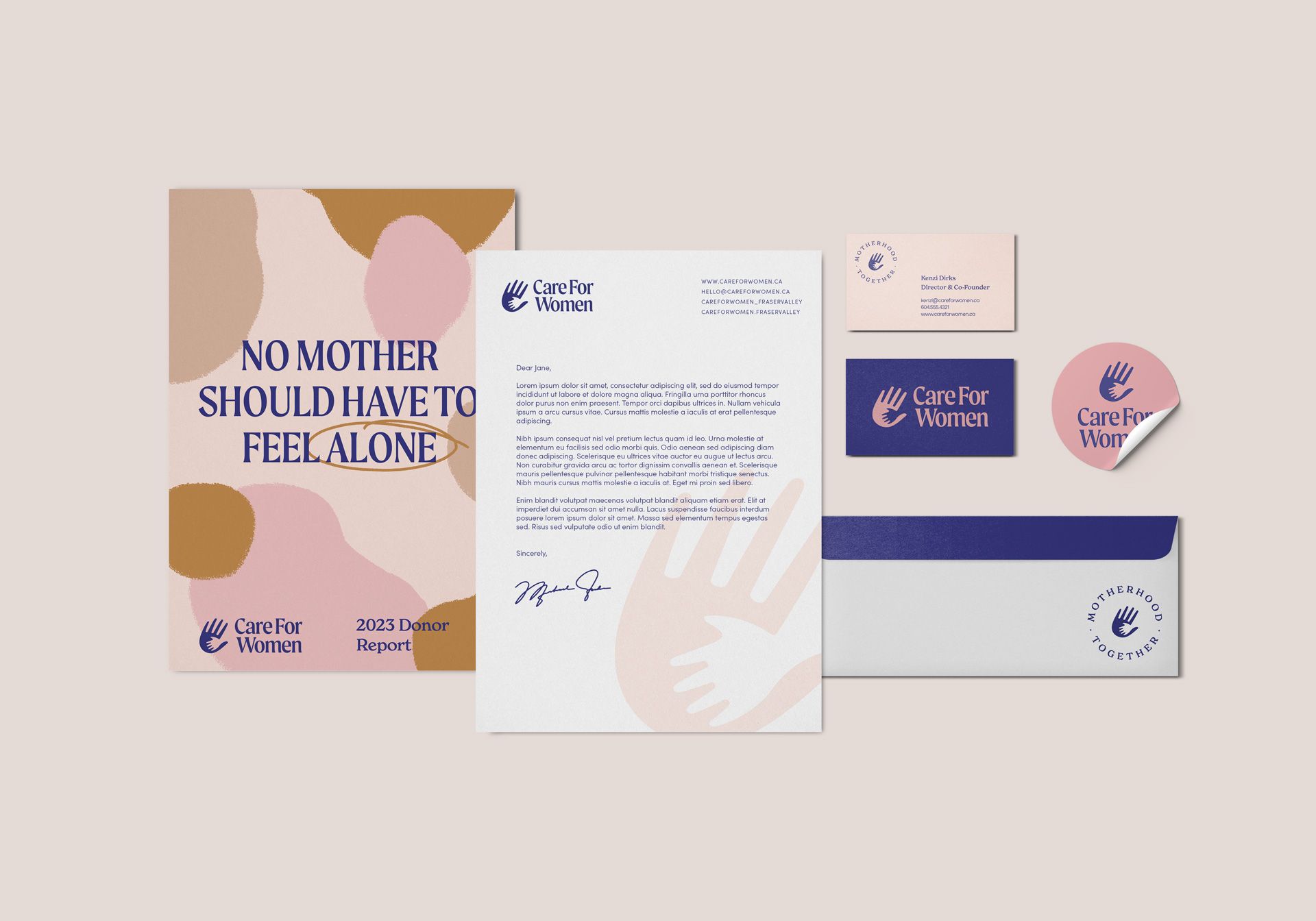 We worked with Care For Women to create a story arch for their brand that articulates the risks that mothers and infants face if left unsupported — and the immediate and generational impact of loving care that can buoy a mother through the challenges of postpartum. We created a visual identity that feels like new motherhood: tender, raw, messy, and intense — with a warm and earthy colour palette, hand-drawn icons, organic shapes and textures, and bold yet approachable typography.